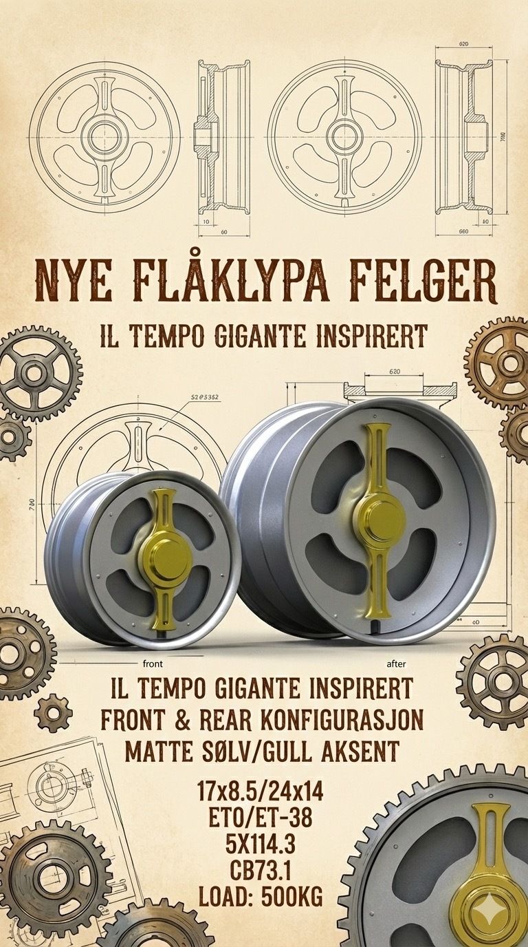Vi presenterer her en av de mest spesialiserte felgeproduksjonene i norsk bilbyggerhistorie. Et hjulsett utviklet utelukkende for rekreasjonen av Il Tempo Gigante i sin aller første form – slik Kjell Aukrust faktisk tegnet bilen først, før alle senere tolkninger, fargeendringer og filmatiserte variasjoner.